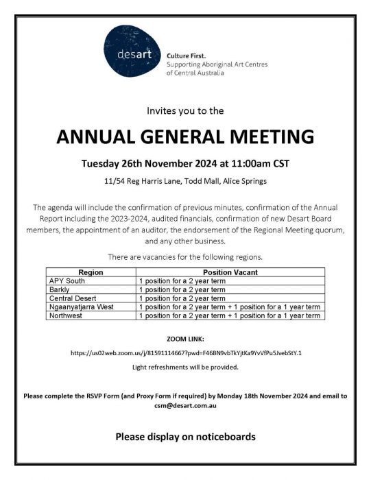 News Desart Annual General Meeting 2024 October 23, 2024 Desart invites our members to our Annual General Meeting, Tuesday 26th November 2024, 11:00am CST. Please RSVP by Monday 18th November to csm@desart.com.au. Download AGM Notice ← →