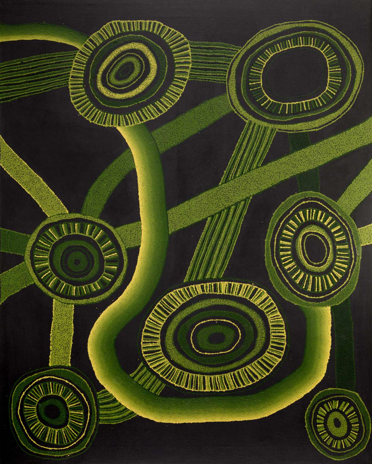 Marina Pumani Brown was born in Mimili Community on the APY Lands in the far north-west of South Australia. She comes from a long line of painters. Her grandmother was Milatjari Pumani, who was one of the most famous artists in the APY region. Her mother is Betty Kuntiwa Pumani and her aunt was Ngupulya Pumani. Marina grew up watching these strong Pumani women paint. Learning from them, and beside them, she has since developed her own interpretation of the Tjukurpa passed on to her.