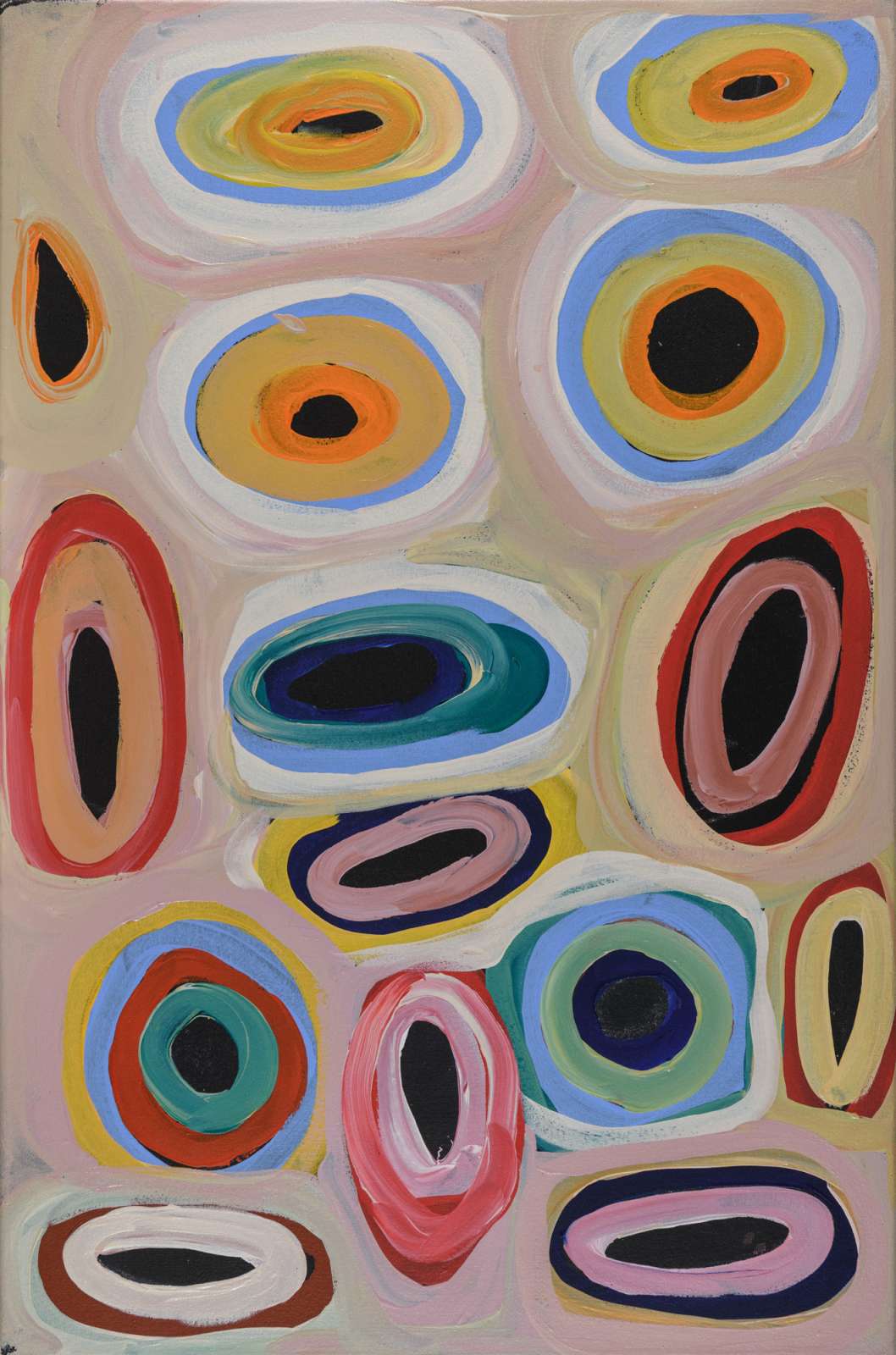 Wantili is my place, where I was born. It’s a place where everyone was living–it’s all of their ngurra (home). It’s the Jukurrpa (Dreaming) of that place. All those claypans, a place where everyone comes together for ceremony and gatherings, all meeting with different families. I went there with my aunt [Jakayu Biljabu] and my sister [Kumpaya Girgirba]- they told me the story of where I was born, in pujiman (traditional, desert dwelling) times. We walked all over the place, I was just a little one.