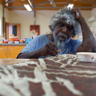 Bobby West Tjupurrula is the son of Freddy West Tjakamarra, one of the original shareholders of Papunya Tula Artists. He was born at the rockhole site of Tjamu Tjamu, which is east of Kiwirrkura. Bobby’s family was met by Jeremy Long’s welfare patrol in 1963. At the time his family was camping at Willi rockholes, slightly east of Walungurru (Kintore). Bobby appears with his family in the book The Lizard Eaters by Douglas Lockwood, which documents the 1963 patrol. He commenced painting for Papunya Tula Artist in the late 1980’s.